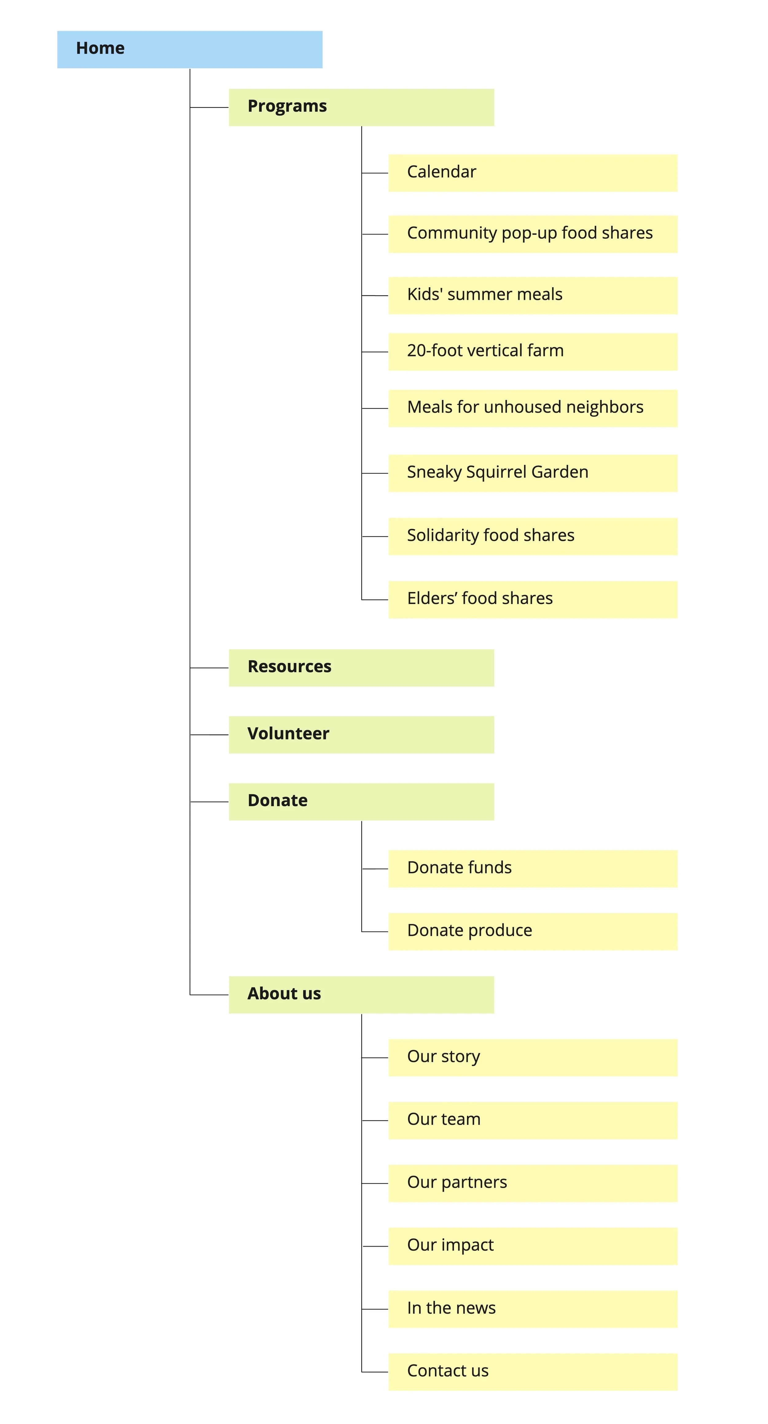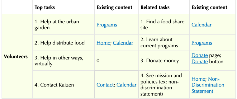 I then did a more detailed review of the existing content to see where it met top tasks and if there were any gaps. For volunteers, for instance, calls to get involved are distributed across the home page, “Calendar” page, and “Programs” page.