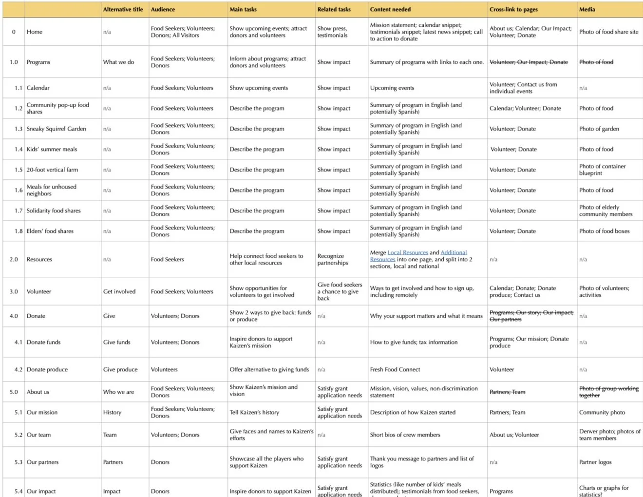 The project kicked off with a call with Thai Nguyen, the founder of Kaizen Food Rescue. I had done a preliminary review of the website based on the Catchafire project description, but needed to make sure I understood Thai’s goals and expectations. I asked about the evolution of the website and for access to the analytics.