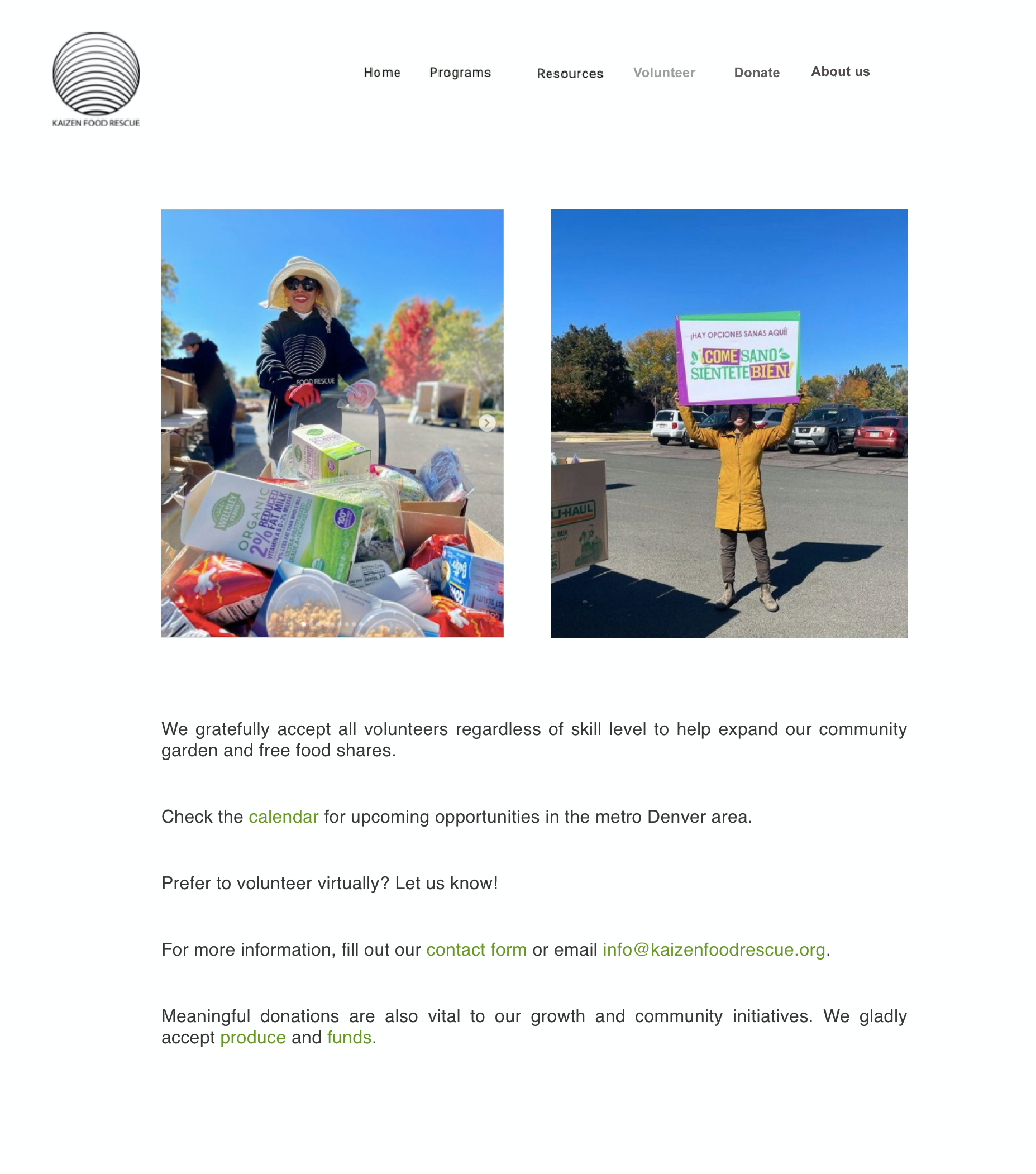 There is no dedicated “Volunteer” page, however. In addition to attracting volunteers in Denver, Kaizen might want to consider listing virtual ways to get involved, especially if help is needed with the newsletter and social media planning.