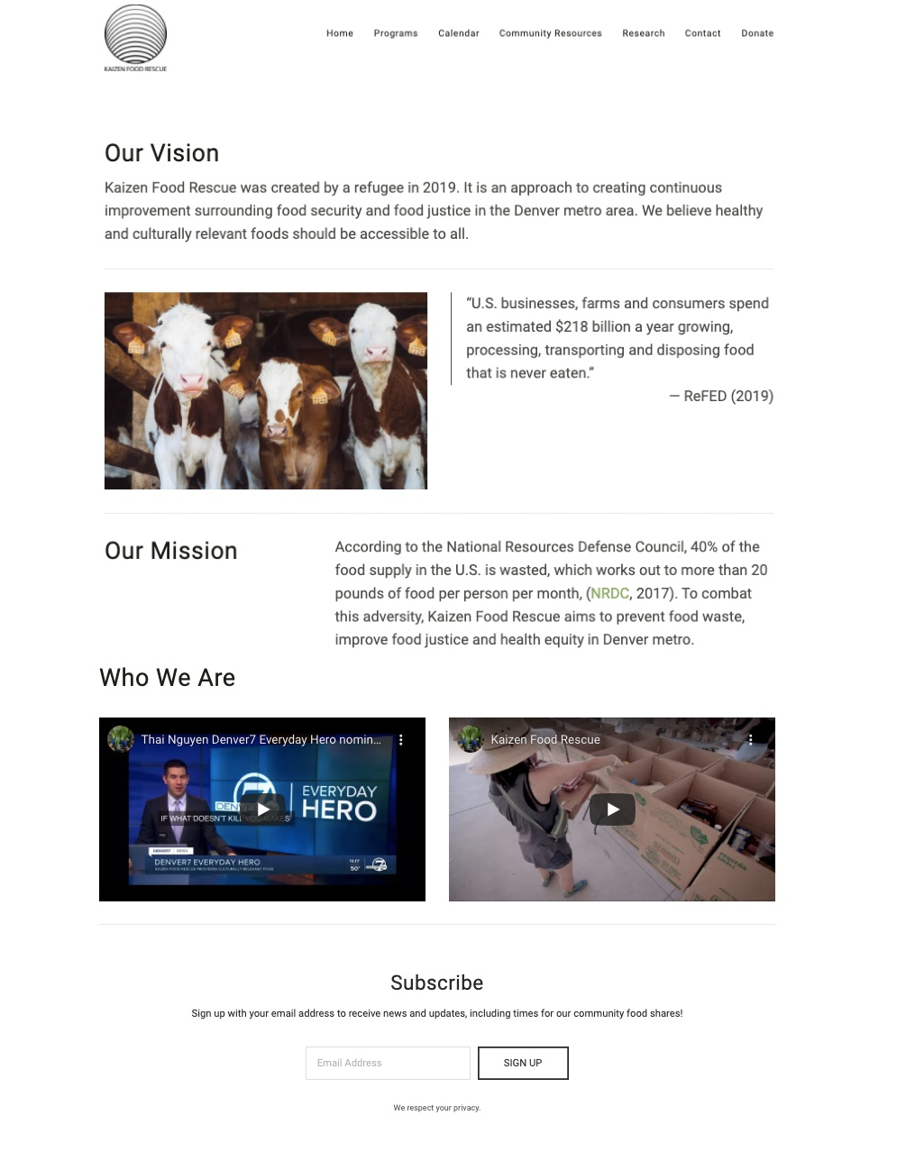 I connected with Kaizen Food Rescue via Catchafire, a site where nonprofits post projects they need help with. I learned from their founder that she “threw the website together” for launch and she now wanted to tell a more cohesive story about their food access work in the Denver metro area. I was intrigued and decided to commit to the project pro bono.