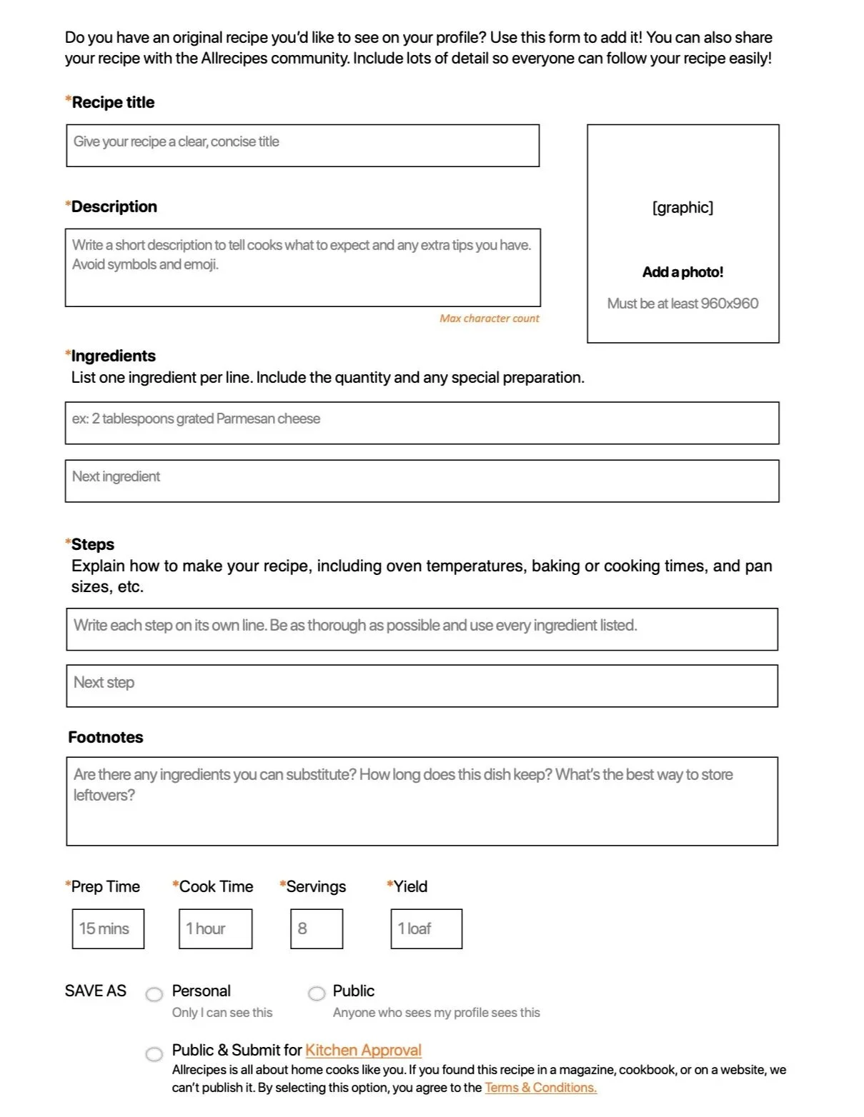 | No description of the form's purpose. | Add a basic instruction at the top: “Use this form to share your recipe with the Allrecipes community. Include lots of detail so others can follow your recipe easily!” |